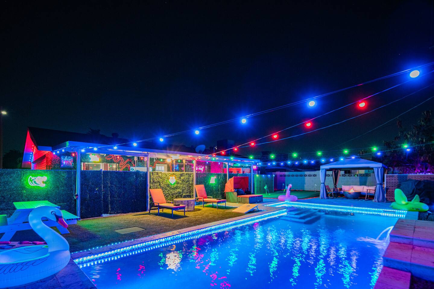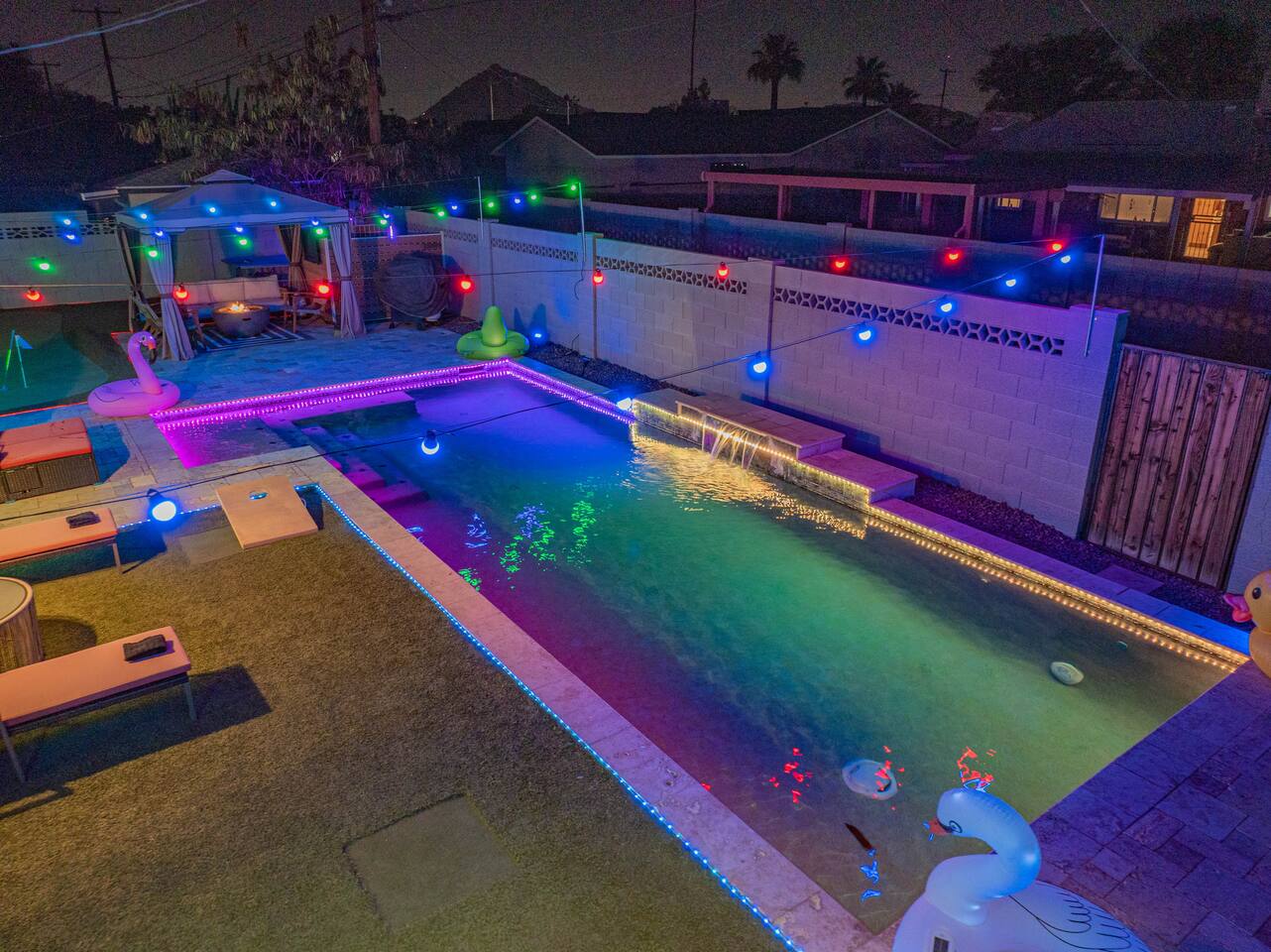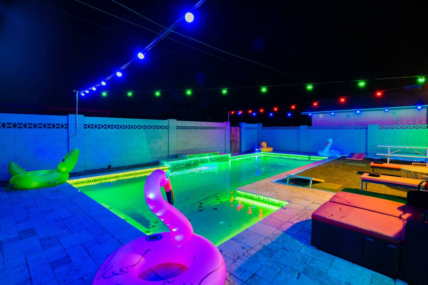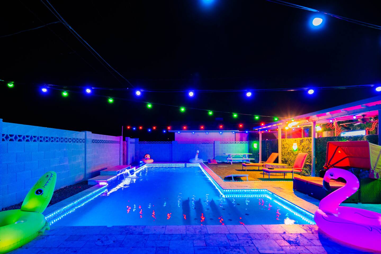Experience our newly remodeled home with exceptional amenities and be among the first to stay. This 4-bedroom home sleeps 14 and has everything you need to relax and unwind. Cook, dine, lounge, and laugh together in bright, open spaces designed for good times, with lots of golfing and hiking within minutes. Every space is well equipped, crafted for comfort and relaxation, and available for short- and long-term stays. Perfect for families, friends, business travelers, and groups seeking an extraordinary Arizona getaway. Make our home your home! Reserve your stay today and create unforgettable memories! ✦Property Highlights✦ ✦ Outdoor Oasis → A Lush Green Wall with a swing door offers visibility into the pool, designed with parents in mind for added safety. → 5-Person LED Hot Tub with color-changing lights around the base and inside for a visually stunning soak. → 4-Person Dry Sauna with mood-enhancing exterior LED lighting, perfect for detoxing and relaxation. → A Floating Swing Daybed (1,600 lb capacity) seats 4–6 and is perfectly positioned between the RGB bar, hot tub, and 55" outdoor TV. → The stylish bench with a neon sign and grass wall is perfect for group photos and social content. → Rainforest decor, including framed jungle animals, LED ground lighting, and a playful glowing snake design around the TV (he’s friendly, promise!). → 96 Feet of RGB Lighting, hanging bulbs, and roof strip lights for a dynamic, relaxing ambiance. → Cooling Misters lower the temperature by up to 20°F and complete the rainforest “rain” vibe, even in peak summer. ✦ Pool → Color-Changing LED pool lighting for safe, stunning nighttime swims. → 45-Bulb RGB hanging Lights to illuminate the entire space and extend your time outdoors. → Outdoor dining bench for 6–8 guests. → 2 Red Chaise Loungers + Outdoor Daybed (seats 2–3) for sunbathing or stargazing. → Color-changing pool floaties, squirt guns, and ample beach towels for the pool, hot tub, and sauna. ✦ Gazebo Area → Propane BBQ Grill → Elegant Stone Fireplace to cozy up on chilly nights. → A 4-person couch and three stylish chairs for lounging. → Lit-Up Mini Golf Course with LED strips for nighttime play. → Full-Size Ping Pong Table with RGB lamps for evening matches. → 40” 4K Smart TV, ideally placed to catch sports or stream shows while enjoying the fire or the nearby putting green. ✦ Secret Outdoor Lounge (Master Room Area) → Enclosed Green Wall offers privacy for this tucked-away gem. → Features 4 Cowhide Chairs, 2 wooden side tables, and a mysterious treasure chest—who knows what’s inside? ✦ Living + Dining → 50” Smart TV → Sleeper Options: Pull-out couch (sleeps 2) and a futon (sleeps 1). → PlayStation + subscription (stream and play games without bringing your own) → Nintendo Switch with 4 controllers + popular games like Smash Bros., Mario Kart, and Mario Wonder. → Open Layout with a vibrant mural and a 6-seat wooden dining table set against a stylish backdrop of white cabinets and a dark stone backsplash. ✦ Kitchen → A fully equipped Kitchen includes a stainless steel refrigerator, an island prep area, a washer/dryer, and a K-Cup coffee machine for quick morning brews. → Color-Changing Lighting for fun, customizable ambiance. ✦ Bedrooms (Sleeps 12) → 4 stylish bedrooms with 6 queen beds → All Rooms Include: → Floating bed frames with LED lighting → Ceiling mood lighting → Smart TVs with LED backlights → Closets, lamps, and charging stations ✦ Bathrooms → 2 Modern style bathrooms with color-changing rainfall showerheads ✦ Parking → Covered carport + driveway (fits 3), safe street parking → RGB-lit entrance and glowing night ambiance