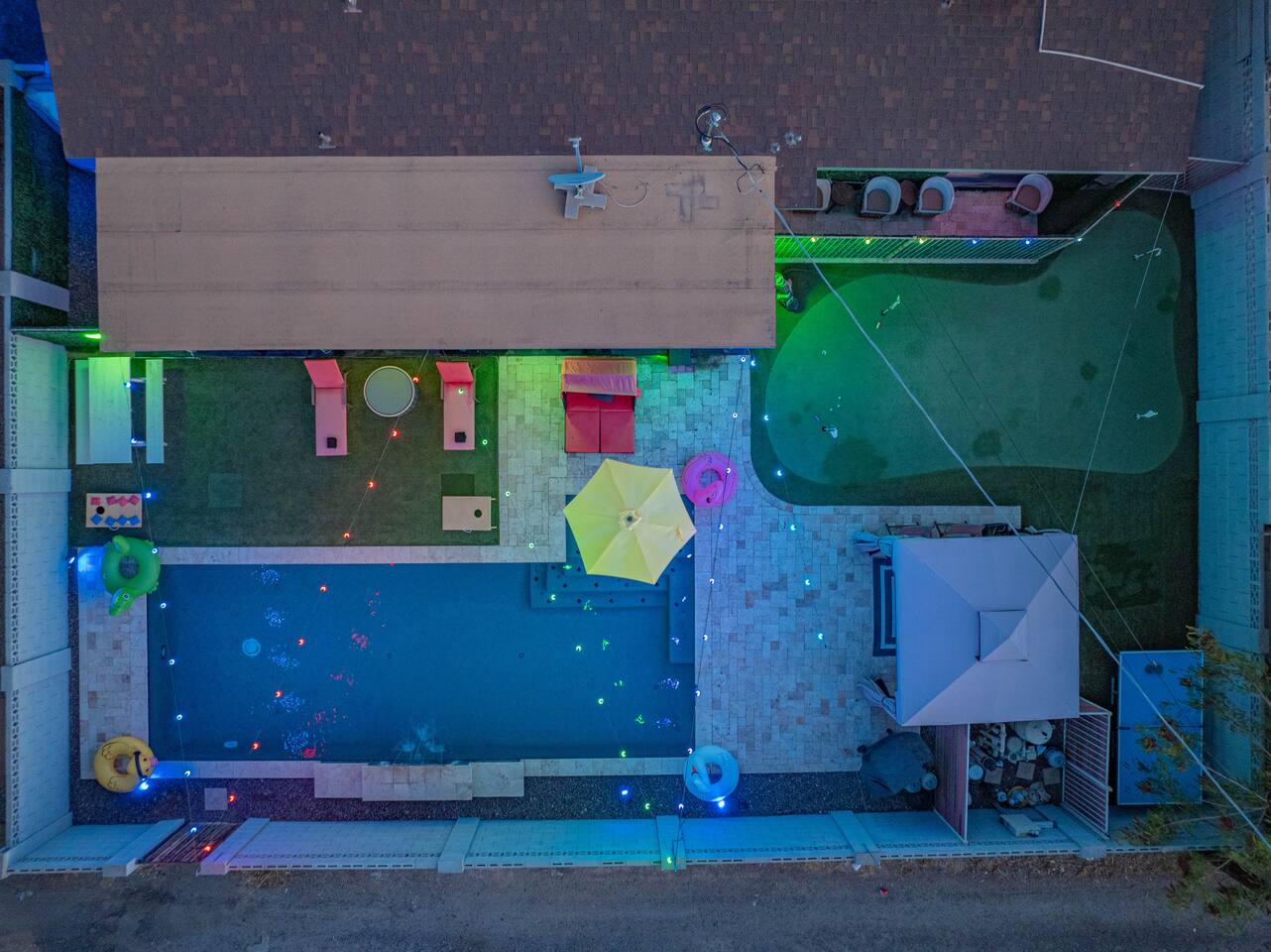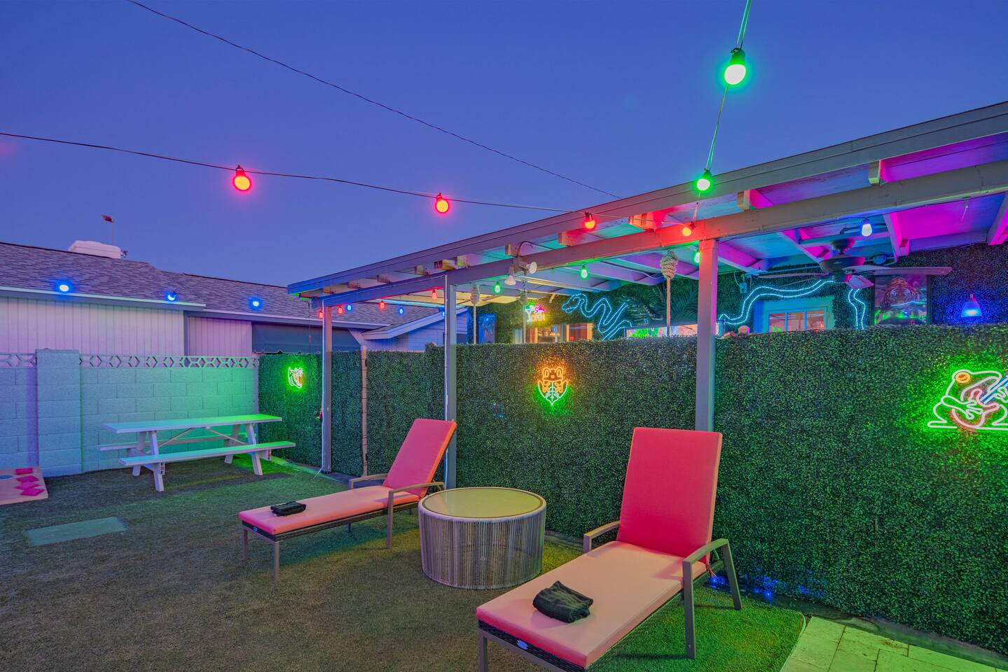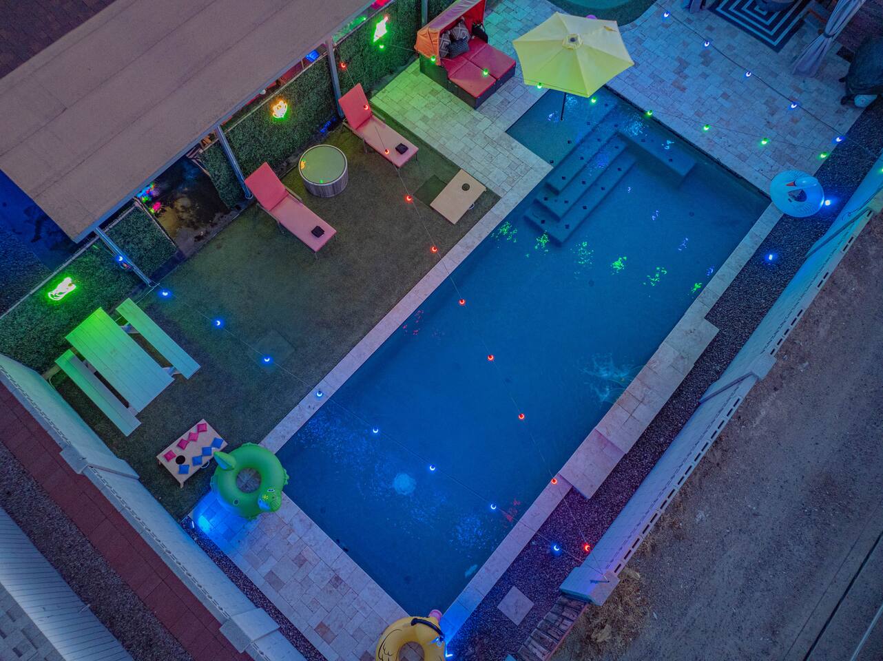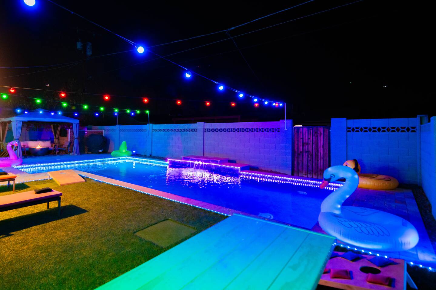 Experience our newly remodeled home with exceptional amenities and be among the first to stay. This 4-bedroom home sleeps 14 and has everything you need to relax and unwind. Cook, dine, lounge, and laugh together in bright, open spaces designed for good times, with lots of golfing and hiking within minutes. Every space is well equipped, crafted for comfort and relaxation, and available for short- and long-term stays. Perfect for families, friends, business travelers, and groups seeking an extraordinary Arizona getaway. Make our home your home! Reserve your stay today and create unforgettable memories! ✦Property Highlights✦ ✦ Outdoor Oasis → A Lush Green Wall with a swing door offers visibility into the pool, designed with parents in mind for added safety. → 5-Person LED Hot Tub with color-changing lights around the base and inside for a visually stunning soak. → 4-Person Dry Sauna with mood-enhancing exterior LED lighting, perfect for detoxing and relaxation. → A Floating Swing Daybed (1,600 lb capacity) seats 4–6 and is perfectly positioned between the RGB bar, hot tub, and 55" outdoor TV. → The stylish bench with a neon sign and grass wall is perfect for group photos and social content. → Rainforest decor, including framed jungle animals, LED ground lighting, and a playful glowing snake design around the TV (he’s friendly, promise!). → 96 Feet of RGB Lighting, hanging bulbs, and roof strip lights for a dynamic, relaxing ambiance. → Cooling Misters lower the temperature by up to 20°F and complete the rainforest “rain” vibe, even in peak summer. ✦ Pool → Color-Changing LED pool lighting for safe, stunning nighttime swims. → 45-Bulb RGB hanging Lights to illuminate the entire space and extend your time outdoors. → Outdoor dining bench for 6–8 guests. → 2 Red Chaise Loungers + Outdoor Daybed (seats 2–3) for sunbathing or stargazing. → Color-changing pool floaties, squirt guns, and ample beach towels for the pool, hot tub, and sauna. ✦ Gazebo Area → Propane BBQ Grill → Elegant Stone Fireplace to cozy up on chilly nights. → A 4-person couch and three stylish chairs for lounging. → Lit-Up Mini Golf Course with LED strips for nighttime play. → Full-Size Ping Pong Table with RGB lamps for evening matches. → 40” 4K Smart TV, ideally placed to catch sports or stream shows while enjoying the fire or the nearby putting green. ✦ Secret Outdoor Lounge (Master Room Area) → Enclosed Green Wall offers privacy for this tucked-away gem. → Features 4 Cowhide Chairs, 2 wooden side tables, and a mysterious treasure chest—who knows what’s inside? ✦ Living + Dining → 50” Smart TV → Sleeper Options: Pull-out couch (sleeps 2) and a futon (sleeps 1). → PlayStation + subscription (stream and play games without bringing your own) → Nintendo Switch with 4 controllers + popular games like Smash Bros., Mario Kart, and Mario Wonder. → Open Layout with a vibrant mural and a 6-seat wooden dining table set against a stylish backdrop of white cabinets and a dark stone backsplash. ✦ Kitchen → A fully equipped Kitchen includes a stainless steel refrigerator, an island prep area, a washer/dryer, and a K-Cup coffee machine for quick morning brews. → Color-Changing Lighting for fun, customizable ambiance. ✦ Bedrooms (Sleeps 12) → 4 stylish bedrooms with 6 queen beds → All Rooms Include: → Floating bed frames with LED lighting → Ceiling mood lighting → Smart TVs with LED backlights → Closets, lamps, and charging stations ✦ Bathrooms → 2 Modern style bathrooms with color-changing rainfall showerheads ✦ Parking → Covered carport + driveway (fits 3), safe street parking → RGB-lit entrance and glowing night ambiance