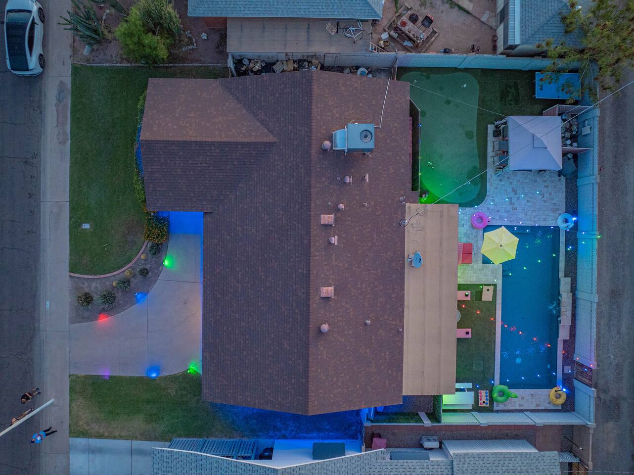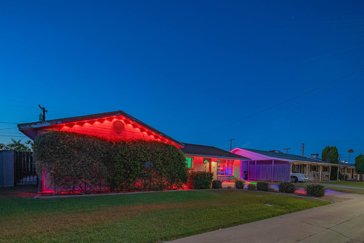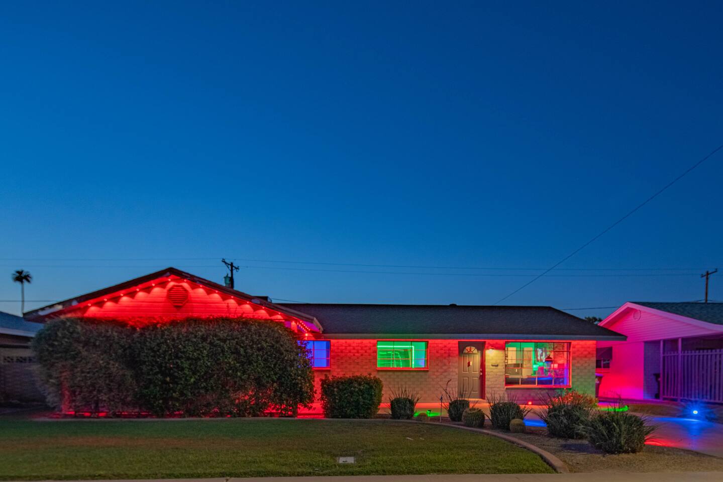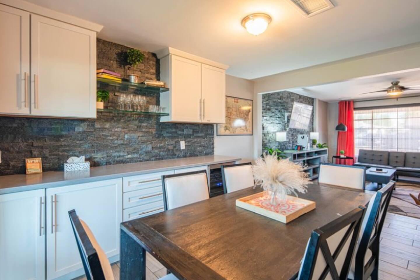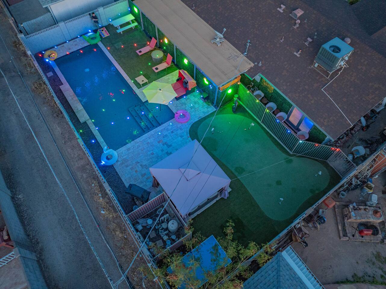 Experience our newly remodeled home with exceptional amenities and be among the first to stay. This 4-bedroom home sleeps 14 and has everything you need to relax and unwind. Cook, dine, lounge, and laugh together in bright, open spaces designed for good times, with lots of golfing and hiking within minutes. Every space is well equipped, crafted for comfort and relaxation, and available for short- and long-term stays. Perfect for families, friends, business travelers, and groups seeking an extraordinary Arizona getaway. Make our home your home! Reserve your stay today and create unforgettable memories! ✦Property Highlights✦ ✦ Outdoor Oasis → A Lush Green Wall with a swing door offers visibility into the pool, designed with parents in mind for added safety. → 5-Person LED Hot Tub with color-changing lights around the base and inside for a visually stunning soak. → 4-Person Dry Sauna with mood-enhancing exterior LED lighting, perfect for detoxing and relaxation. → A Floating Swing Daybed (1,600 lb capacity) seats 4–6 and is perfectly positioned between the RGB bar, hot tub, and 55" outdoor TV. → The stylish bench with a neon sign and grass wall is perfect for group photos and social content. → Rainforest decor, including framed jungle animals, LED ground lighting, and a playful glowing snake design around the TV (he’s friendly, promise!). → 96 Feet of RGB Lighting, hanging bulbs, and roof strip lights for a dynamic, relaxing ambiance. → Cooling Misters lower the temperature by up to 20°F and complete the rainforest “rain” vibe, even in peak summer. ✦ Pool → Color-Changing LED pool lighting for safe, stunning nighttime swims. → 45-Bulb RGB hanging Lights to illuminate the entire space and extend your time outdoors. → Outdoor dining bench for 6–8 guests. → 2 Red Chaise Loungers + Outdoor Daybed (seats 2–3) for sunbathing or stargazing. → Color-changing pool floaties, squirt guns, and ample beach towels for the pool, hot tub, and sauna. ✦ Gazebo Area → Propane BBQ Grill → Elegant Stone Fireplace to cozy up on chilly nights. → A 4-person couch and three stylish chairs for lounging. → Lit-Up Mini Golf Course with LED strips for nighttime play. → Full-Size Ping Pong Table with RGB lamps for evening matches. → 40” 4K Smart TV, ideally placed to catch sports or stream shows while enjoying the fire or the nearby putting green. ✦ Secret Outdoor Lounge (Master Room Area) → Enclosed Green Wall offers privacy for this tucked-away gem. → Features 4 Cowhide Chairs, 2 wooden side tables, and a mysterious treasure chest—who knows what’s inside? ✦ Living + Dining → 50” Smart TV → Sleeper Options: Pull-out couch (sleeps 2) and a futon (sleeps 1). → PlayStation + subscription (stream and play games without bringing your own) → Nintendo Switch with 4 controllers + popular games like Smash Bros., Mario Kart, and Mario Wonder. → Open Layout with a vibrant mural and a 6-seat wooden dining table set against a stylish backdrop of white cabinets and a dark stone backsplash. ✦ Kitchen → A fully equipped Kitchen includes a stainless steel refrigerator, an island prep area, a washer/dryer, and a K-Cup coffee machine for quick morning brews. → Color-Changing Lighting for fun, customizable ambiance. ✦ Bedrooms (Sleeps 12) → 4 stylish bedrooms with 6 queen beds → All Rooms Include: → Floating bed frames with LED lighting → Ceiling mood lighting → Smart TVs with LED backlights → Closets, lamps, and charging stations ✦ Bathrooms → 2 Modern style bathrooms with color-changing rainfall showerheads ✦ Parking → Covered carport + driveway (fits 3), safe street parking → RGB-lit entrance and glowing night ambiance