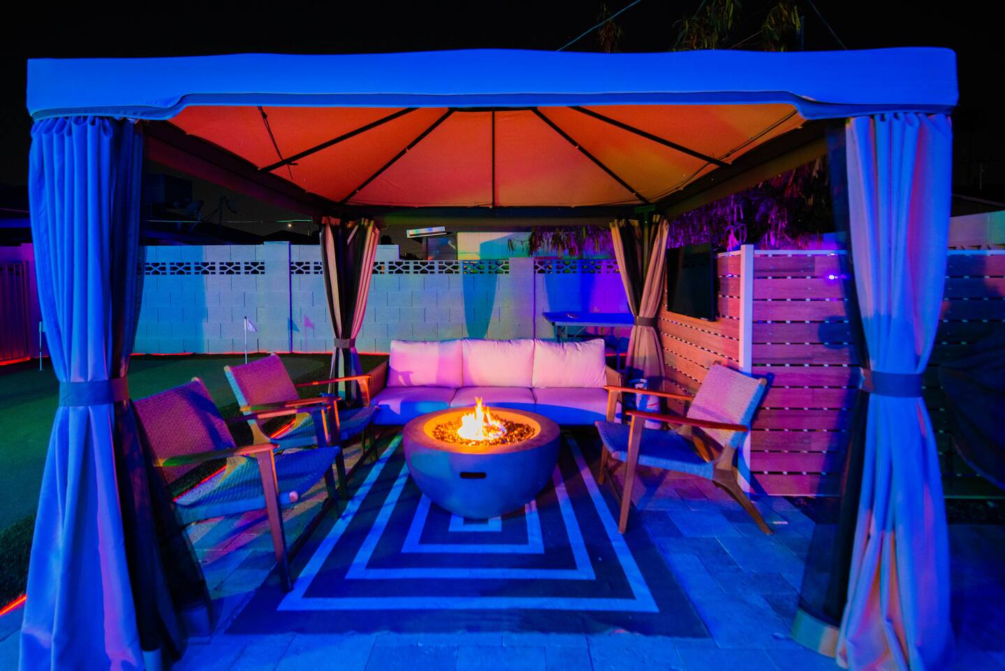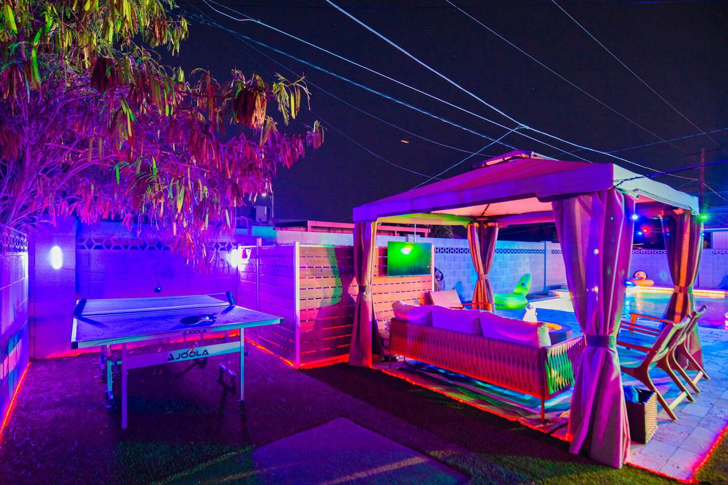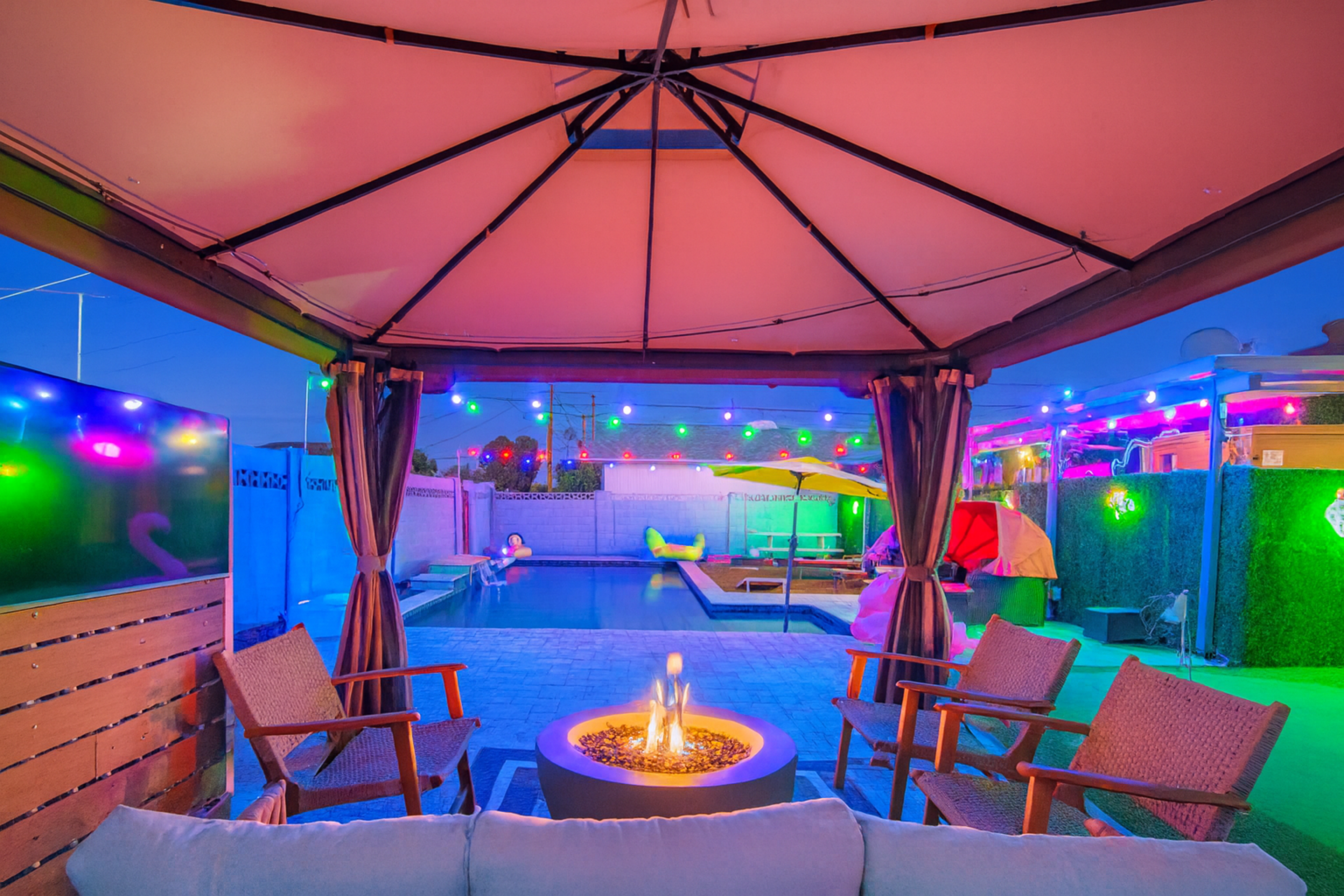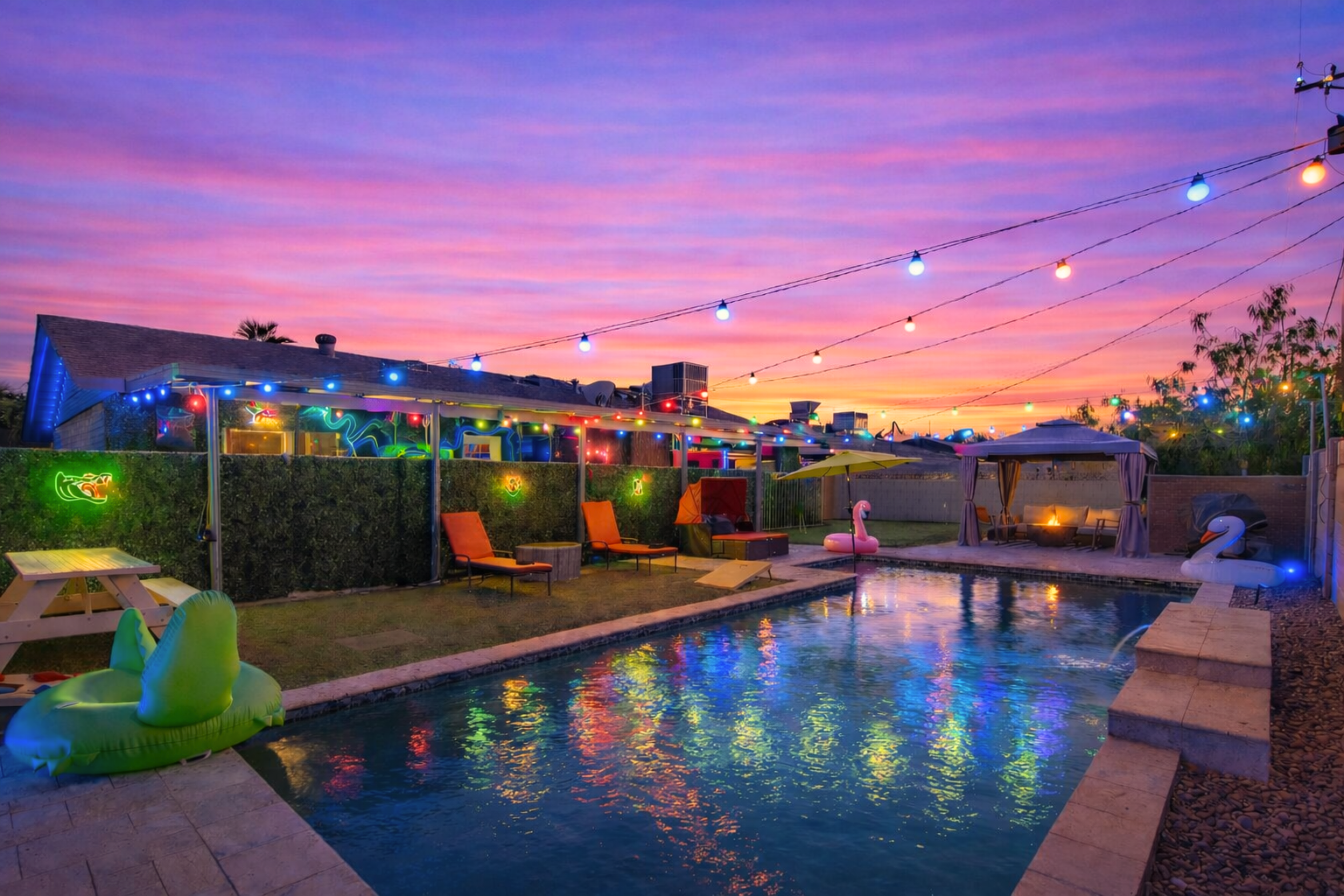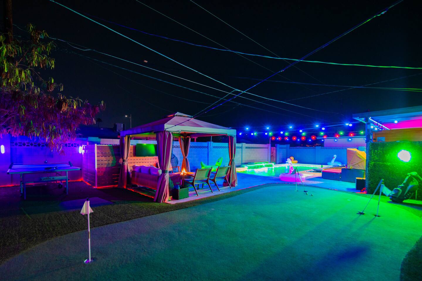 Our Scottsdale home offers a truly unique, resort-style experience designed for relaxation, fun, and unforgettable memories. Guests are welcomed into a newly remodeled 4-bedroom retreat with vibrant decor, mood lighting, and standout amenities, including a private pool, hot tub, dry sauna, putting green, ping pong table, gazebo, and a floating swing daybed. We’ve created a space that feels both luxurious and playful, from rainforest-inspired decor and RGB lighting to gaming consoles and cozy fire pits. Whether it’s enjoying a color-changing soak, stargazing on the sun loungers, or snapping photos by the neon-lit bench, there’s something special around every corner. To make guests feel more welcome, we’ve thought through every detail, from curated seating areas and game-ready living spaces to fully equipped kitchens and smart TVs in every room. It's more than just a stay. It’s an experience made for connection, comfort, and fun.
