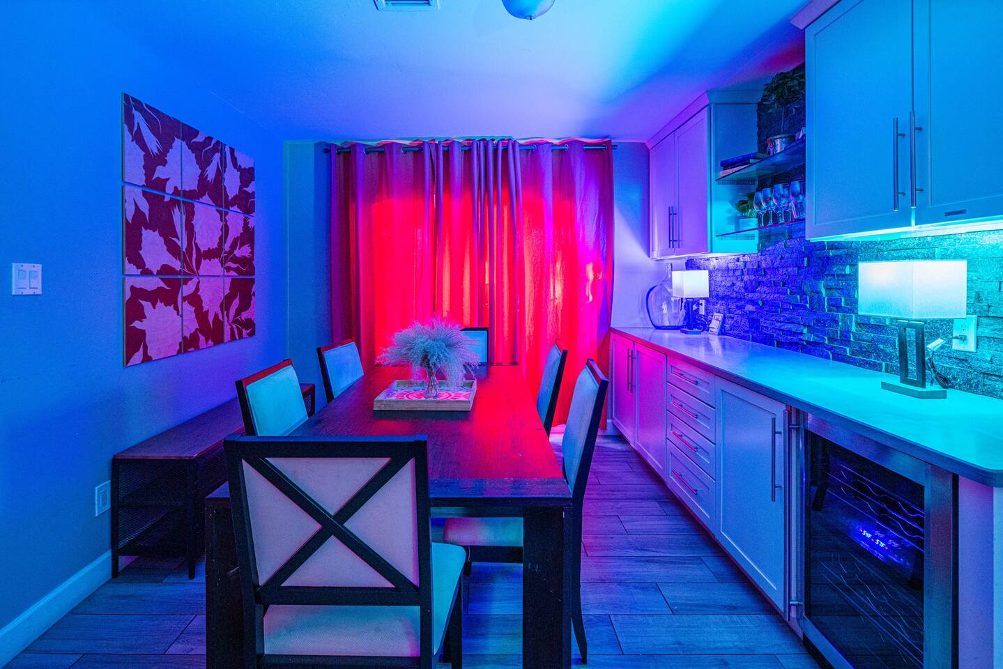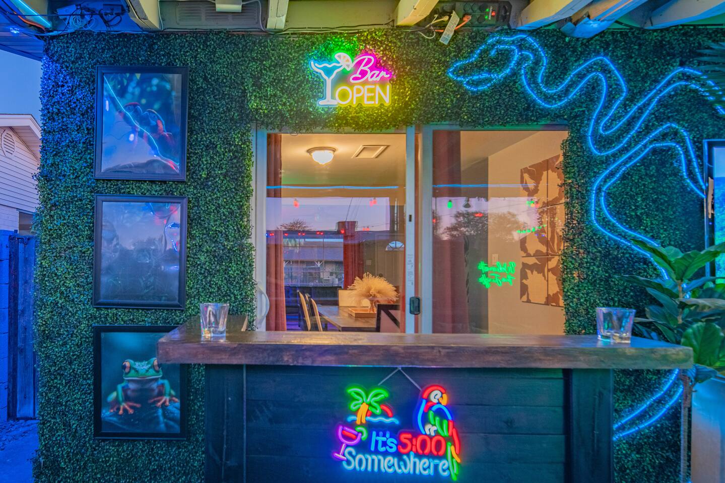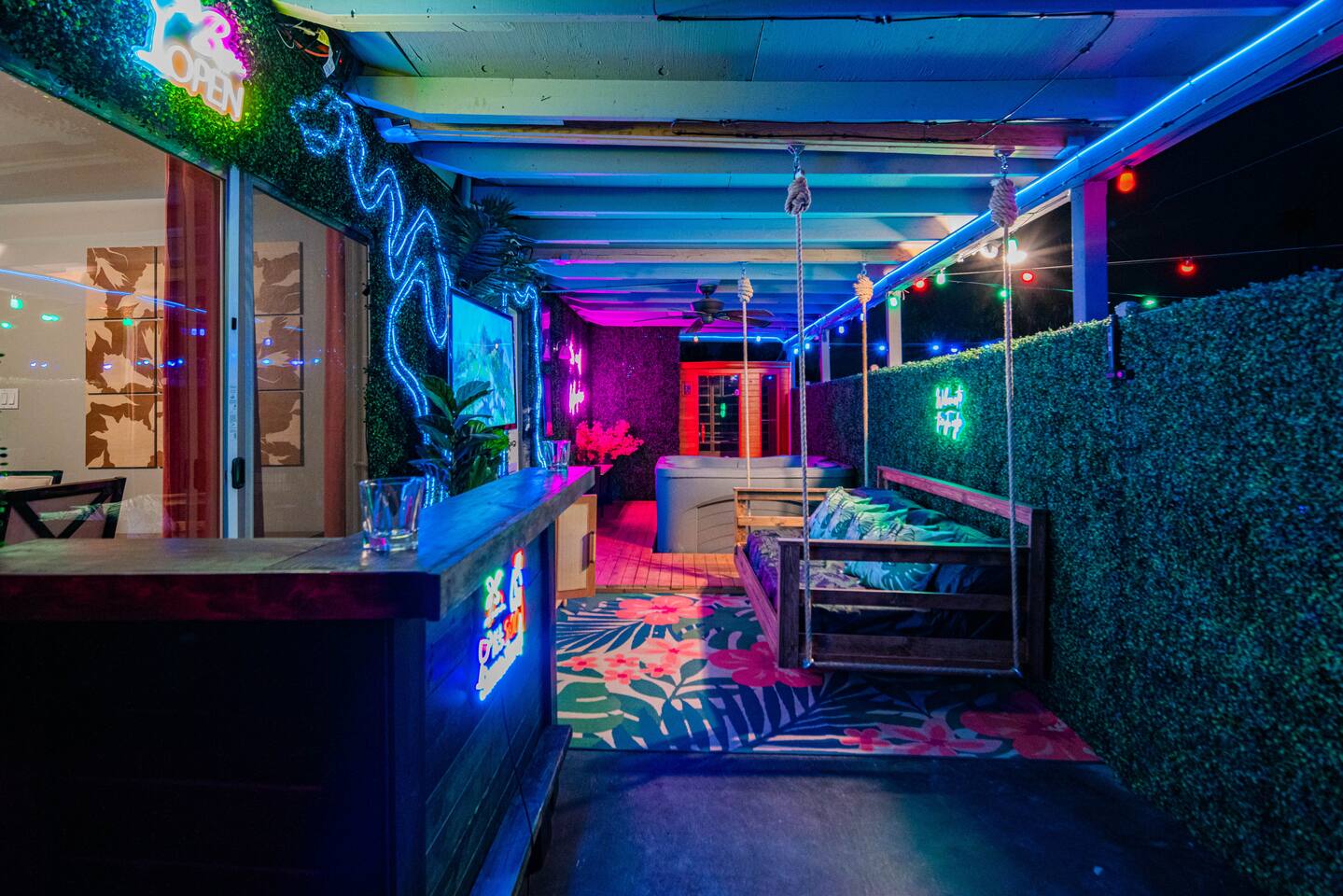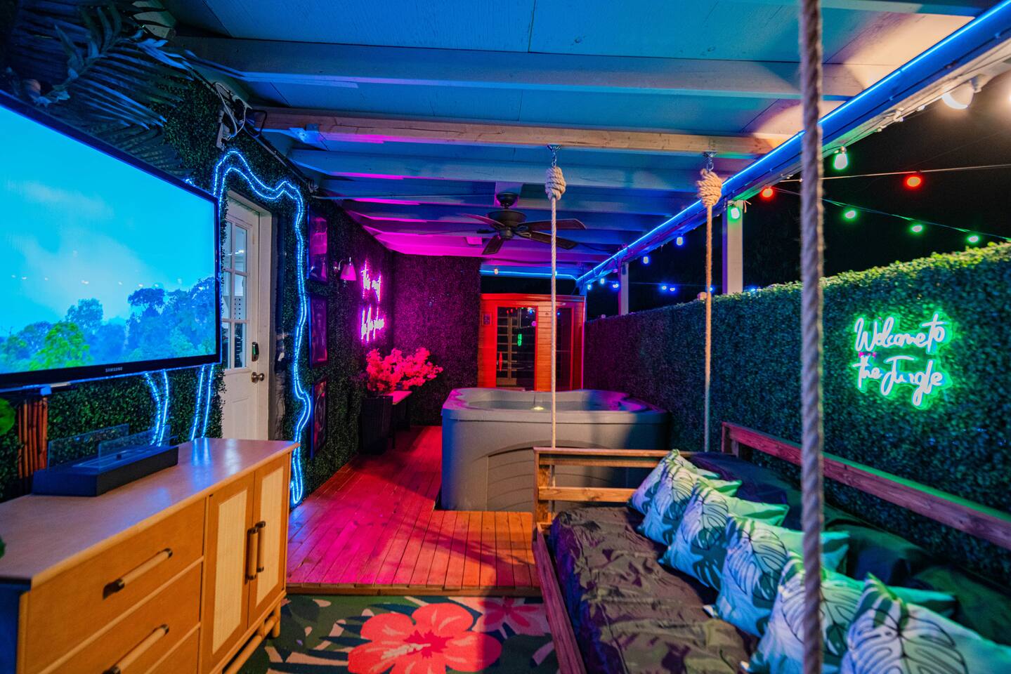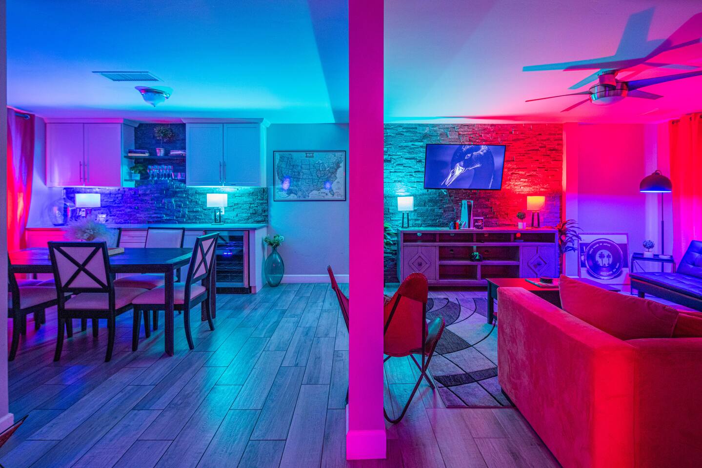 Our Scottsdale home offers a truly unique, resort-style experience designed for relaxation, fun, and unforgettable memories. Guests are welcomed into a newly remodeled 4-bedroom retreat with vibrant decor, mood lighting, and standout amenities, including a private pool, hot tub, dry sauna, putting green, ping pong table, gazebo, and a floating swing daybed. We’ve created a space that feels both luxurious and playful, from rainforest-inspired decor and RGB lighting to gaming consoles and cozy fire pits. Whether it’s enjoying a color-changing soak, stargazing on the sun loungers, or snapping photos by the neon-lit bench, there’s something special around every corner. To make guests feel more welcome, we’ve thought through every detail, from curated seating areas and game-ready living spaces to fully equipped kitchens and smart TVs in every room. It's more than just a stay. It’s an experience made for connection, comfort, and fun.